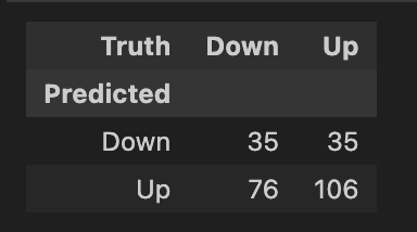 그 후, 학습된 모델을 사용하여 각 데이터 샘플에 대해서 주가가 상승할 확률을 계산한다. 계산한 값이 0.5보다 크면 up, 작으면 down이 되고 원래 데이터의 direction컬럼과 비교하는 작업을 수행한다.